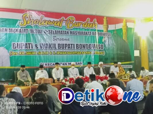 Dengan Ini Bupati Bondowoso KH. Salwa Arifin bersama seluruh elemen masyarakat yang hadir menggelar pembacaan sholawat Burdah berlangsung di Kecamatan Maesan Kabupaten Bondowoso Rabu (20/07/2022) malam.