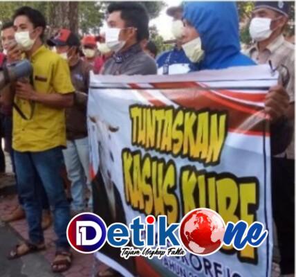 Mereka membawa bhanner bergambar kepala kambing dan tertulis ” TUNTASKAN KASUS KUBE DESA SUKOREJO TAHUN 2020 ”