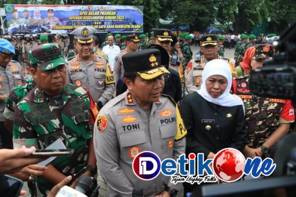 Apel gelar pasukan dipimpin langsung Gubernur Jatim, Khofifah Indar Parawansa, didampingi Kapolda Jatim Irjen Pol Toni Harmanto dan Pangdam V Brawijaya Mayor Jenderal TNI Farid Makruf, Kabinda Jatim, PJU Polda Jatim, PJU Kodam V Brawijaya, diikuti Forkopimda Sidoarjo, Bakesbangpol, Dishub, Satpol-PP, BPBD Provinsi dan Kabupaten.