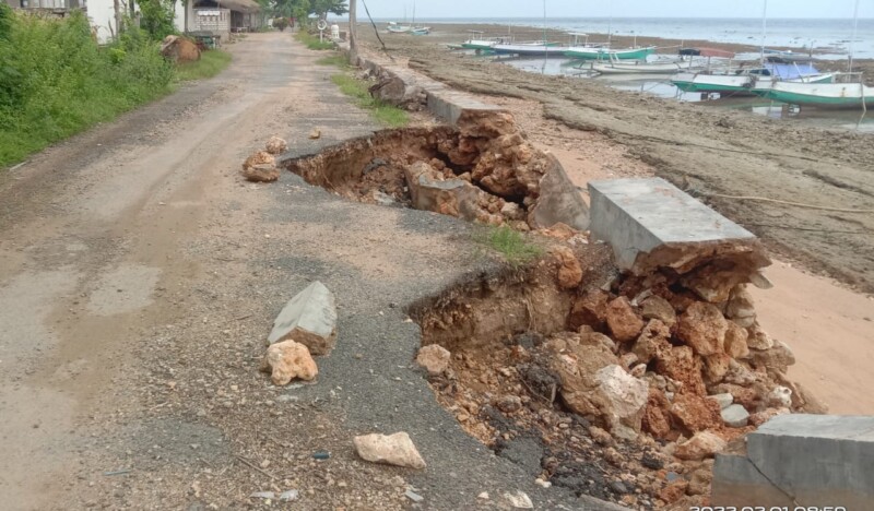 Sumenep, detik1.com – Jalan Raya pesisir Desa Sonok Kecamatan Nonggunong Kabupaten Sumenep, Sangat menghawatirkan keselamatan Masyarakat pengguna jalan, Rusak parahnya jalan pesisir Desa Sonok ini disebabkan 2 hal, yang pertama karena faktor Alam, dimana letak posisi jalan terlalu dekat dengan bibir pantai, sehingga disaat musim angin Barat datang deburan ombak tanpa Tedeng Aleng Aleng menghantam jalanan yang hanya dibatasi tangkis laut.