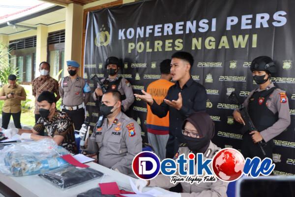 MF beserta barang bukti yang diamankan ditampilkan langsung dalam press release di halaman Mapolres Ngawi, Jumat (16-09-2022).
