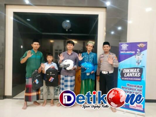 Usai memberikan imbauan kamtibmas dan tadarus bersama, personel Satlantas memberikan tali asih berupa helm dan tas kepada jamaah yang mengikuti kegiatan Dikmas Religi.