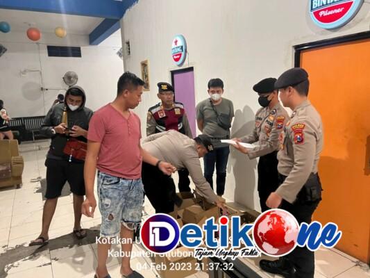 Dalam razia tersebut, personil gabungan Samapta dan Propam menyita puluhan botol minuman keras di salah satu Cafe yang berlokasi di desa Kotakan Situbondo, Sabtu malam (04/02/2023).