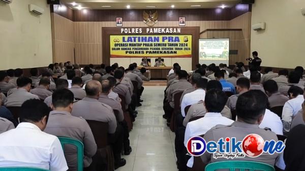 Pamekasan, detik1.co.id // Kepolisian Resor Pamekasan, Madura menggelar Latihan Pra Operasi Mantap Praja Semeru Tahun 2024, bertempat di Gedung Bhayangkara Polres Pamekasan, Senin (12/8/2024).