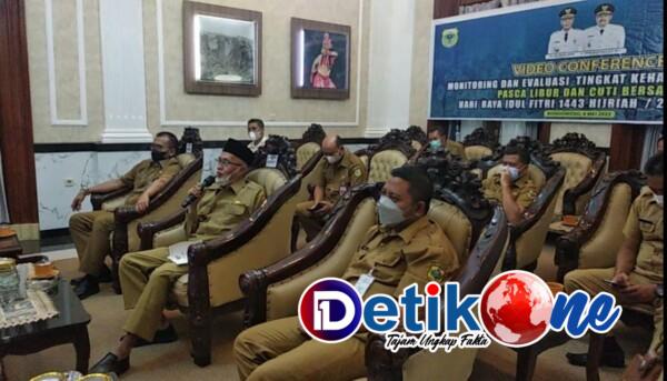 Monitoring dan evaluasi tingkat kehadiran bersama tersebut sekitar 100 satuan kerja (satker) dan organisasi perangkat Daerah (opd) secara Video conference di Perinfgitan pendopo kabupaten pada Senin, (09/05/2022).