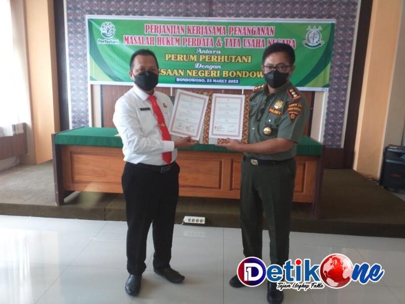 Bondowoso, detik1.com – Berdasarkan surat kuasa khusus (SKK) dari kepala Divisi Regiomal Jawa Timur Nomor 172/SKK/KUM/DIVRE JATIM/2021 tamggal 3 September 2021, terkait penyelesaian masalah hukum bidang Perdata dan Tata usaha negara di wilayah Kabupaten Bondowoso, hari ini Rabu (23/03/2022) Andi Adrian Hidayat Adminustratur Perum Perhutani KPH Bondowoso melaksanakan dan Menanda tangani Perjanjian Kerjasama dengan Kejaksaan Negeri Bondowoso yang dalam hal ini langsung di tanda tangani oleh Puji Triasmoro SH.MH. selaku kepala Kejaksaan Negeri Bondowoso.