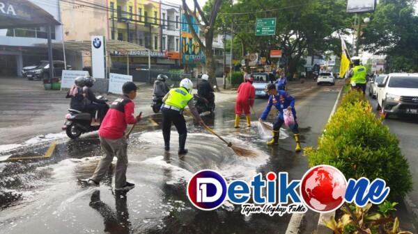 Proses pembersihan tumpahan solar dilakukan oleh tim dari PMK Kota Malang dengan menurunkan 2 unit mobil dan dibantu oleh anggota Satlantas Polresta Malang Kota.