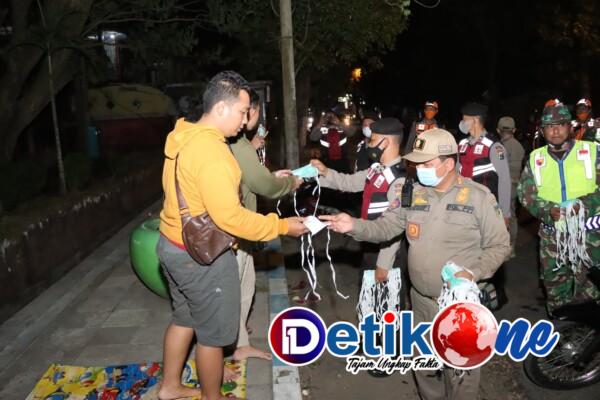 Para personel gabungan ini membagikan masker kepada masyarakat yang tidak mematuhi protokol kesehatan salah satunya tidak memakai masker.