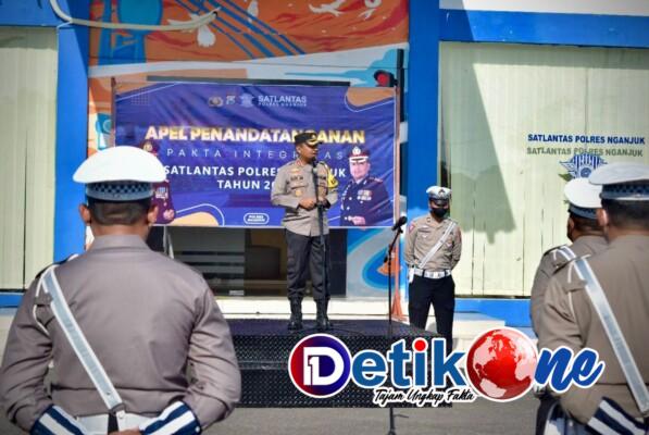Nganjuk, detik1.com – Kapolres Nganjuk AKBP Boy Jeckson menginstruksikan personel Satuan Lalu Lintas Polres Nganjuk untuk lebih mengedepankan tindakan edukatif dan upaya peningkatan kesadaran lalu lintas masyarakat. Hal ini disampaikan dalam arahannya pada apel penandatanganan komitmen Pakta Integritas Satlantas Polres Nganjuk, Senin (31/01/2022).