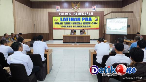 Sebelum melaksanakan Operasi, Polres Pamekasan melaksanakan Latihan Pra Operasi “Tumpas Narkoba Semeru 2024” bertempat di Gedung Bhayangkara Polres Pamekasan, Selasa (10/9/2024).