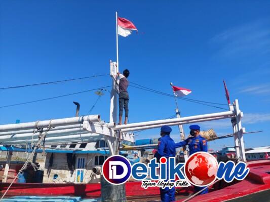 Tampak para anggota Satpolairud Polres Probolinggo membagikan bendera Merah Putih kepada para nelayan untuk dipasang di perahu mereka.