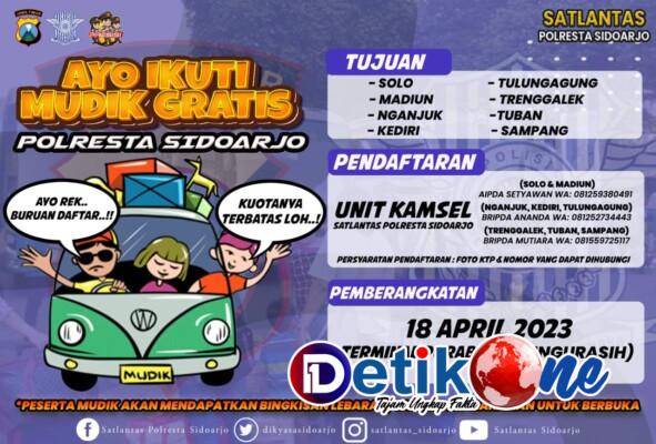 “Pemberangkatan mudik bareng gratis dari kami pada 18 April 2023 dari Terminal Purabaya. Karena kuotanya terbatas, silahkan masyarakat yang hendak mudik segera mendaftar ke unit Kamsel Satlantas Polresta Sidoarjo tanpa dipungut biaya,” kata Kombes Pol. Kusumo Wahyu Bintoro.