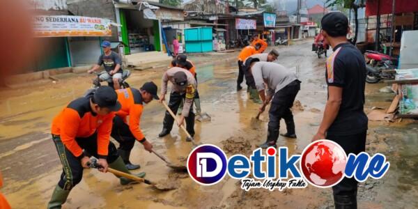 Beberapa pesonel terlihat memotong pohon yang berada di tengah jalan karena terbawa arus banjir. Sementara yang lainnya nampak mengeruk lumpur menggunakan sekop, cankul ataupun peralatan lainnya.
