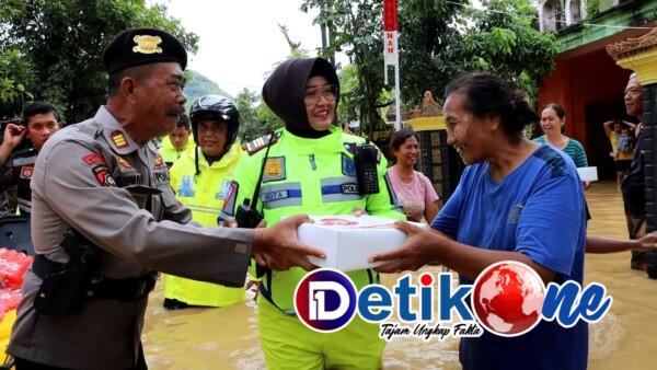Sementara itu Kasat Lantas Trenggalek AKP Meita juga mendatangi pemukiman warga yang terendam banjir sembari membagikan nasi kotak.