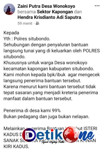 Situbondo, detik1.com – Viral cuitan di media sosial Facebook atas nama Zaini Putra Kepala Desa Wonokoyo terkait bantuan BTPKLWN anggaran tahun 2022 yang di salurkan lewat Polres Situbondo tidak tepat sasaran. pasalnya Akun Facebook Zaini Putra Kepala Desa Wonokoyo (Zen) dalam cuitannya mengatakan bahwasanya penerima di Desanya 99% bukan pedagang dan nelayan, melainkan penerima bantuan tersebut justru istri Kadus dan saudara Kadus.