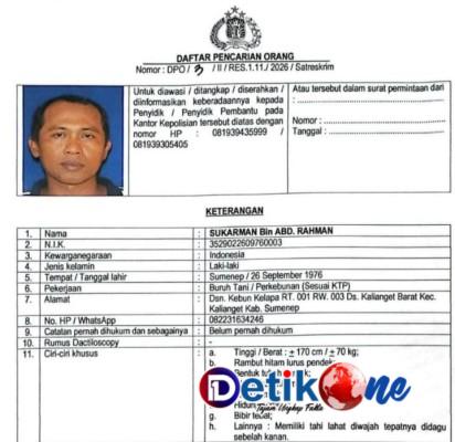 Sementara itu, Polres Sumenep secara resmi menetapkan Sukarman Bin Abdur (50) Tahun warga Kalianget Barat sebagai DPO dengan lNomor : 3/II/Res.1.11/2025 lantaran yang bersangkutan dinilai tidak kooperatif selama proses penyelidikan berlangsung. Sukarman diketahui beberapa kali mangkir dari panggilan penyidik tanpa alasan yang jelas.