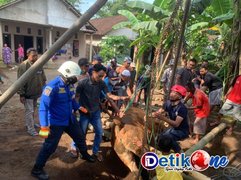 Menurut tim Damkar sapi tersebut berada di bekas galian sumur yang menyebabkan amblas.