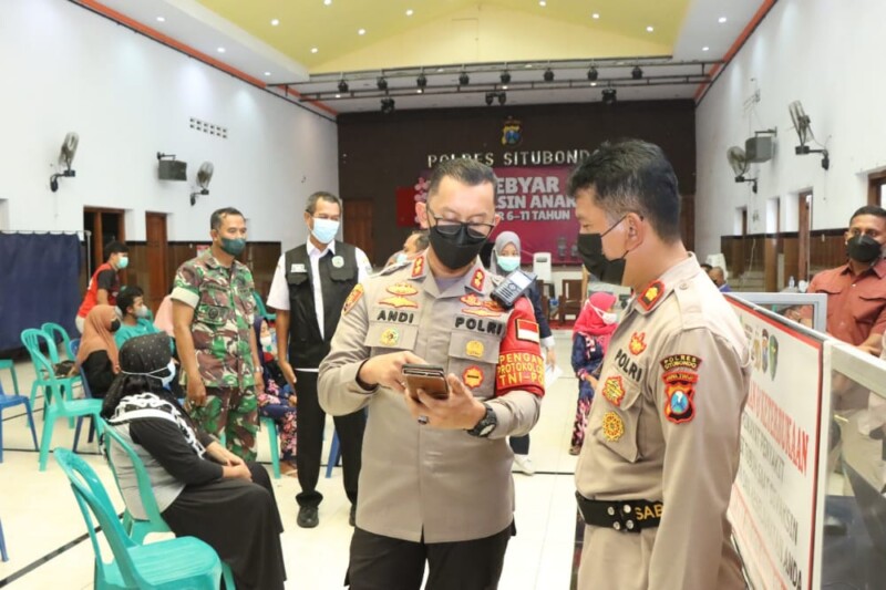 Sesuai arahan Kapolri, untuk mempercepat pencapaian target vaksinasi anak dan lansia, Kapolres Situbondo AKBP Dr. Andi Sinjaya, S.H., S.I.K., M.H. bersama Forkopimda terus menggenjot pelayanan vaksinasi di gerai Vaksin yang tersebar di 17 kecamatan se-Kabupaten Situbondo. Sekaligus proaktif melaksanakan vaksinasi door to door bekerja sama dengan TNI, Satgas Covid-19 kecamatan dan Desa untuk menjangkau wilayah yang terpencil dan jauh dari pusat pelayanan kesehatan.