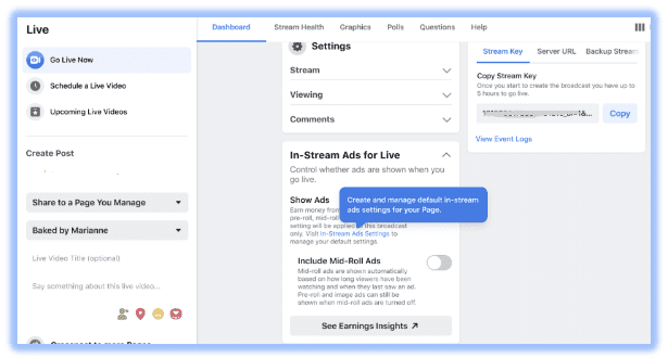 Selain itu, streaming game juga dapat menghasilkan melalui menampilkan iklan In-Stream dari Facebook. Ini merupakan fitur monetisasi video streaming dari Facebook. Dengan cara menampilkan iklan dengan durasi 5-15 detik. Biaya iklan akan di bagi 55% untuk live streaming dan sisanya milik facebook.